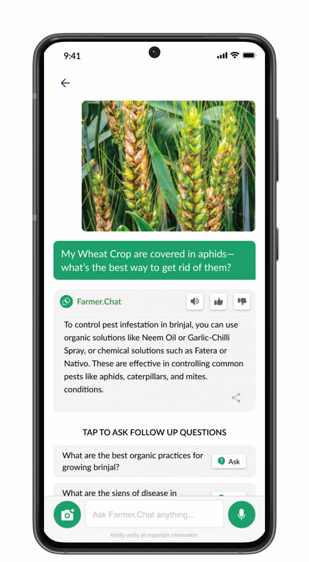 FarmerChat is a conversational, AI-based agricultural companion designed for smallholder farmers, with over 565,000 users across Kenya, Nigeria, Ethiopia, India, and Brazil who have already asked over 5 million queries FarmerChat makes accessing critical agricultural information easy and intuitive. Our AI agent provides contextualized, accurate responses, empowering farmers to make smarter decisions faster.